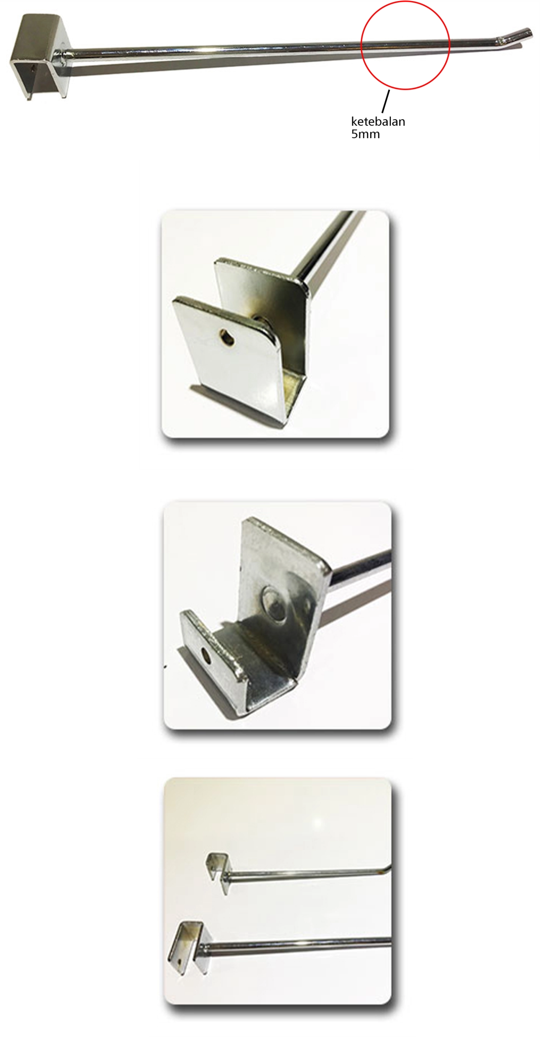 Hook Ram Croom Pipa Kotak adalah gantungan display yang dirancang khusus untuk digunakan pada rel pipa kotak (square pipe) pada sistem rak gondola atau rak display gantung. Terbuat dari besi berlapis chrome mengkilap, hook ini memberikan tampilan premium dan tahan lama, ideal untuk menata produk gantung secara rapi, praktis, dan profesional.