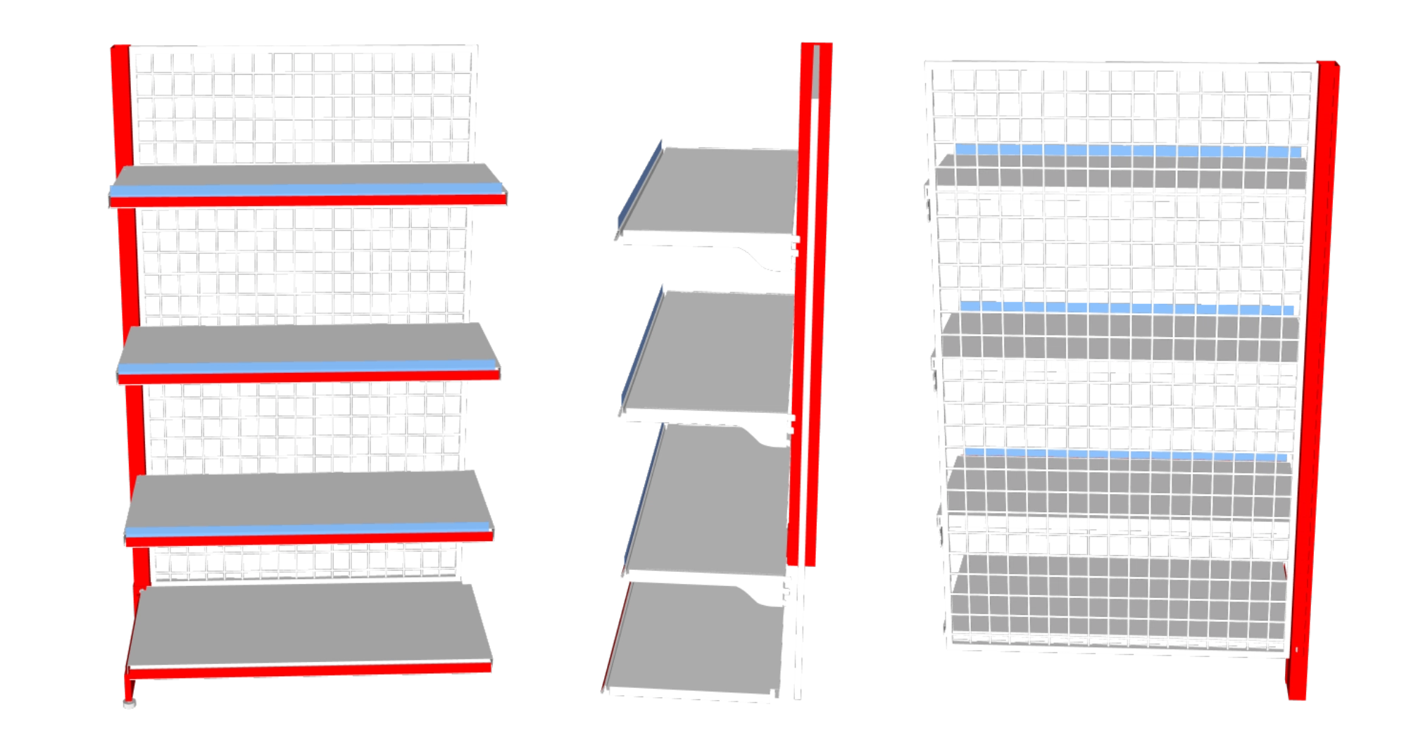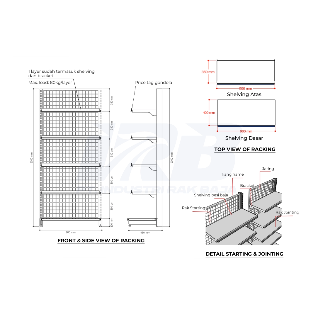 Kelengkapan Unit | – 1 pcs Tiang gondola – 1 pcs Jaring gondola – 1 pcs Penutup dasar samping gondola – 1 pcs Shelving dasar 90x40cm – 3–4 pcs Shelving atas 30cm–35cm – 6–8 pcs Bracket gondola 30cm–35cm |