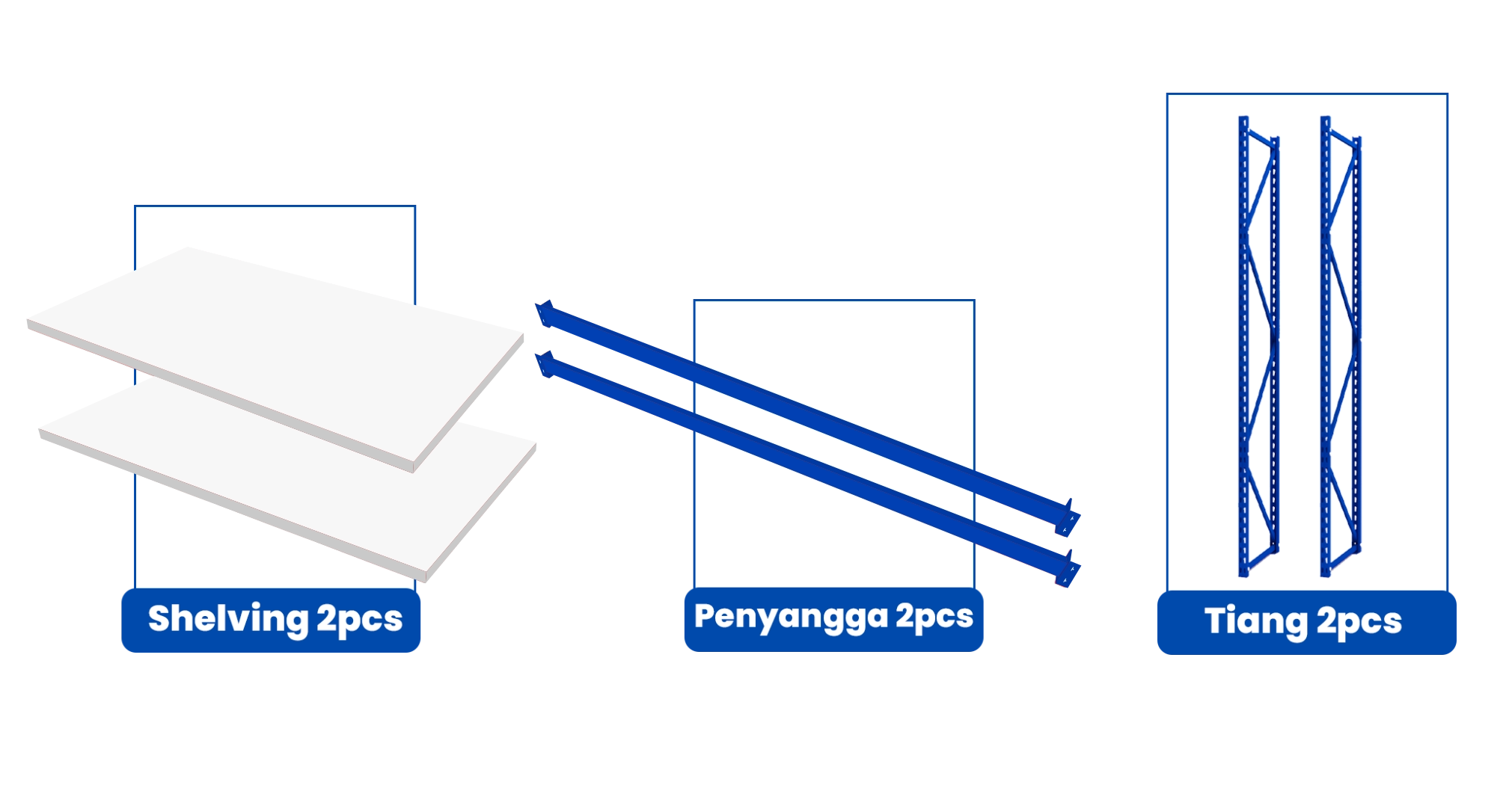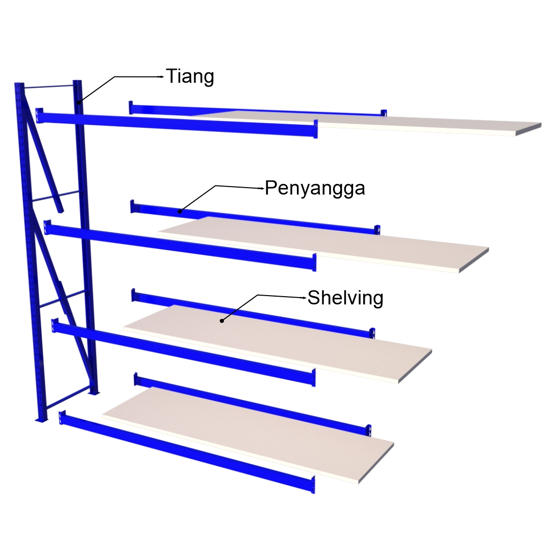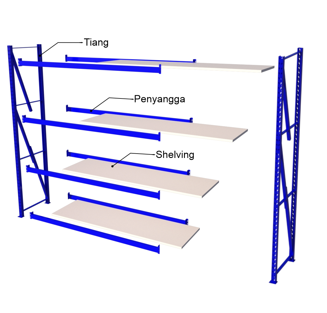 Kelengkapan Unit | – 2 pcs Frame (Tiang Rak Stock) – 8 pcs Beam (Penopang Horizontal) – 8 pcs Layer Plate (Ambalan/Shelving) |